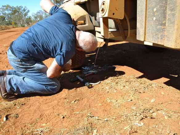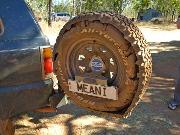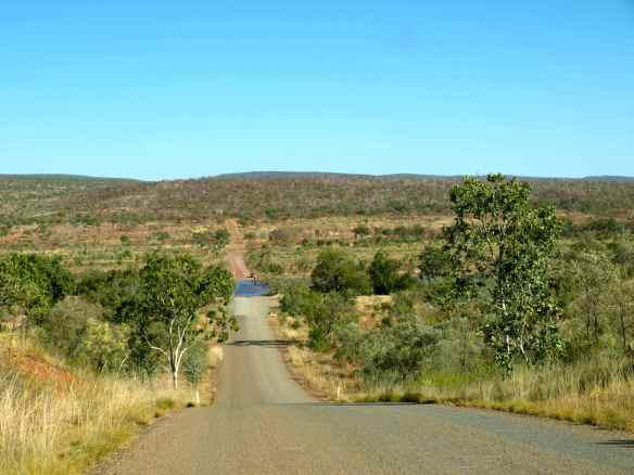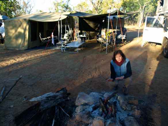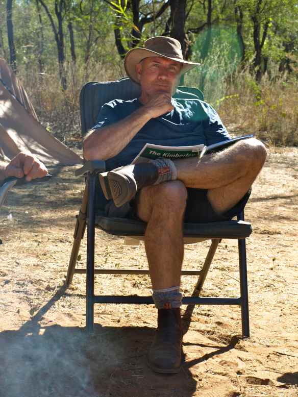 We set off from El Questro on the ‘notorious’ Gibb River Road. Well we wondered what all the fuss was about regarding the Gibb River Road, it was like driving on a highway!……until we caught up with the Grader 200kms on! Then we understood why it is called the ‘notorious’ Gibb River Road, corrugations, potholes and lots of red dust! We crossed the Hahn River and stopped for a cuppa and a couple of grey nomads following us said our trailer was leaking! Rod climbed under and had a look and found the take off point for the water tank had split, probably received a hit from a rock and we were losing water from our tank fast. He put his bushcraft skills to use and carved a wedge from a stick with his trusty pocket knife to plug the hole. It will at least get us to the next stop where we can reassess our water situation. We made our way to Mount Barnett Roadhouse where we set up camp, lit a campfire and set ourselves up for the night.