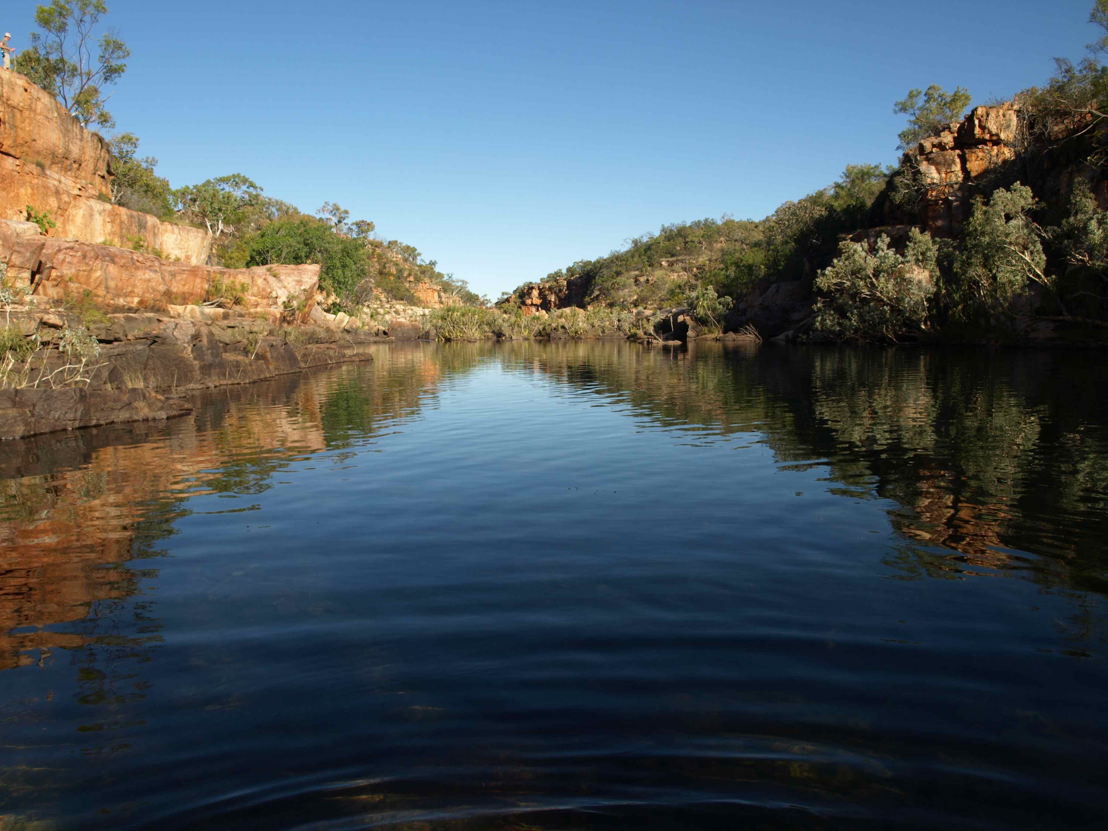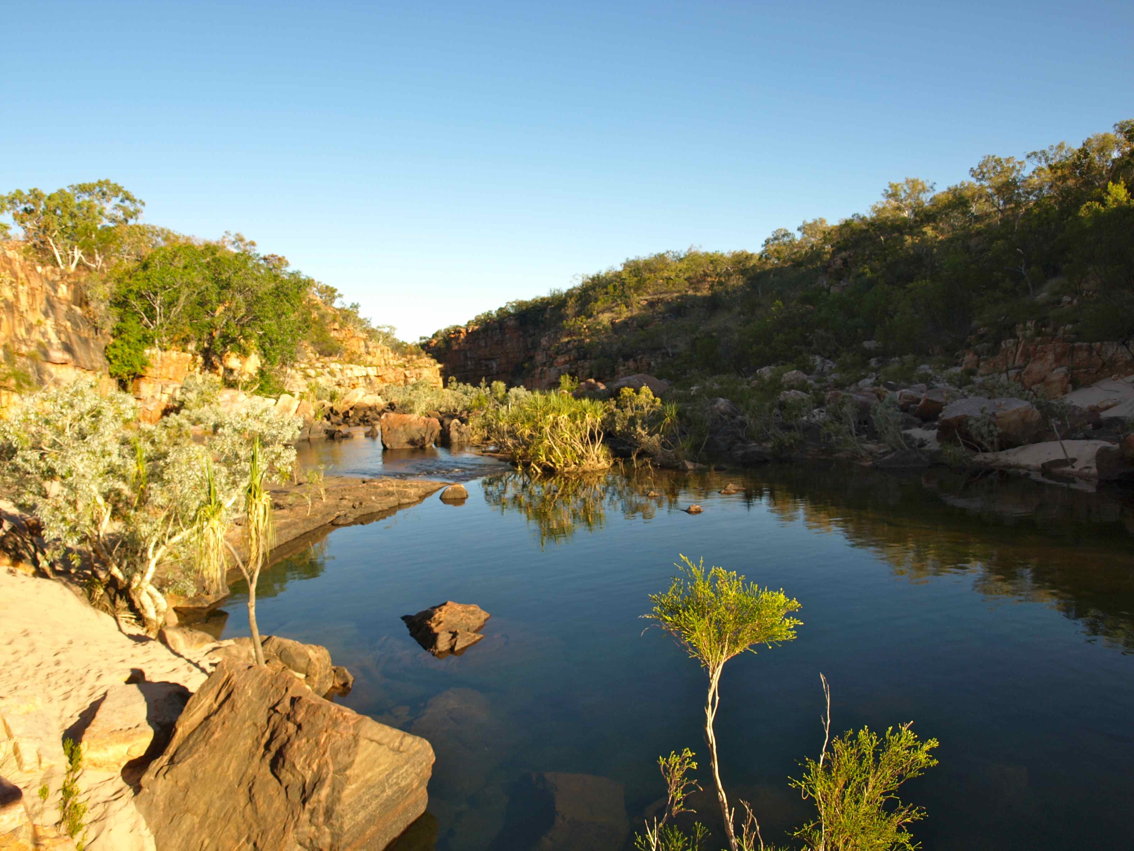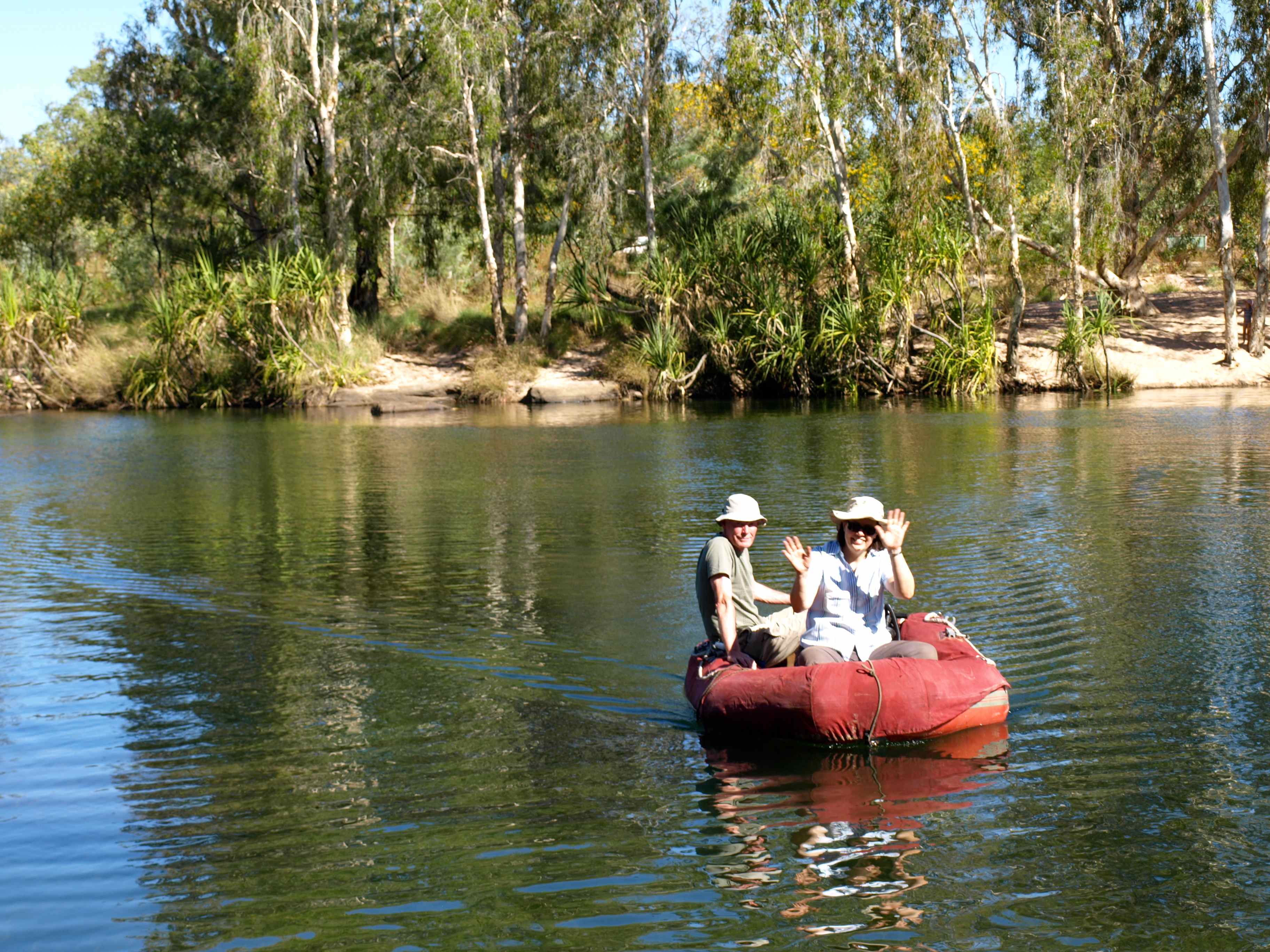 Woke up to a cold morning, and the sound of birds and the Manning River gurgling in the background. We repoked the fire, put on a coffee, made some breakfast and waited for the sun to come up. We still seem to be on Sydney time, having early mornings and early nights. We are sleeping so well, the pod is cosy and warm, which is just as well as the nights and early mornings have been cold with the days warming up to about 23 degrees, perfect weather for bushwalking and inspecting the beautiful gorges around the Kimberly. Today we are heading off to the Manning Gorge which was about a 1 hour walk from our campsite. We needed to cross the river to begin the walk, luckily we had Brian’s Barge to get us across the river, or else it would have been a cold swim.