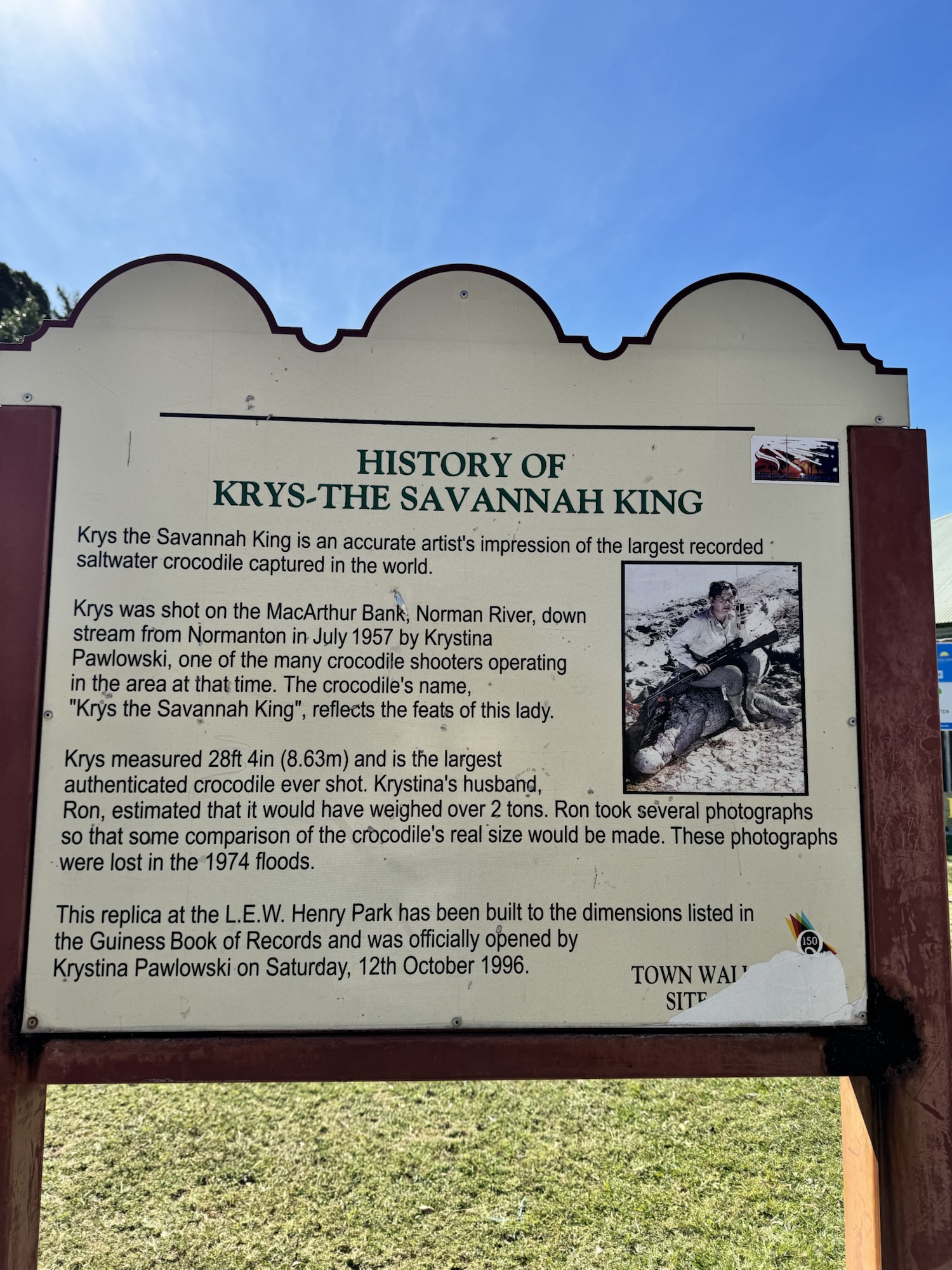 After leaving the Savannah Way we made our way up to Karumba which is on the coast in Gulf country. It was a long drive, but once we were there it was beautiful. We called into Normanton on the way to visit ‘Krys’ a replica of the largest captured croc which was 8.6metres long!