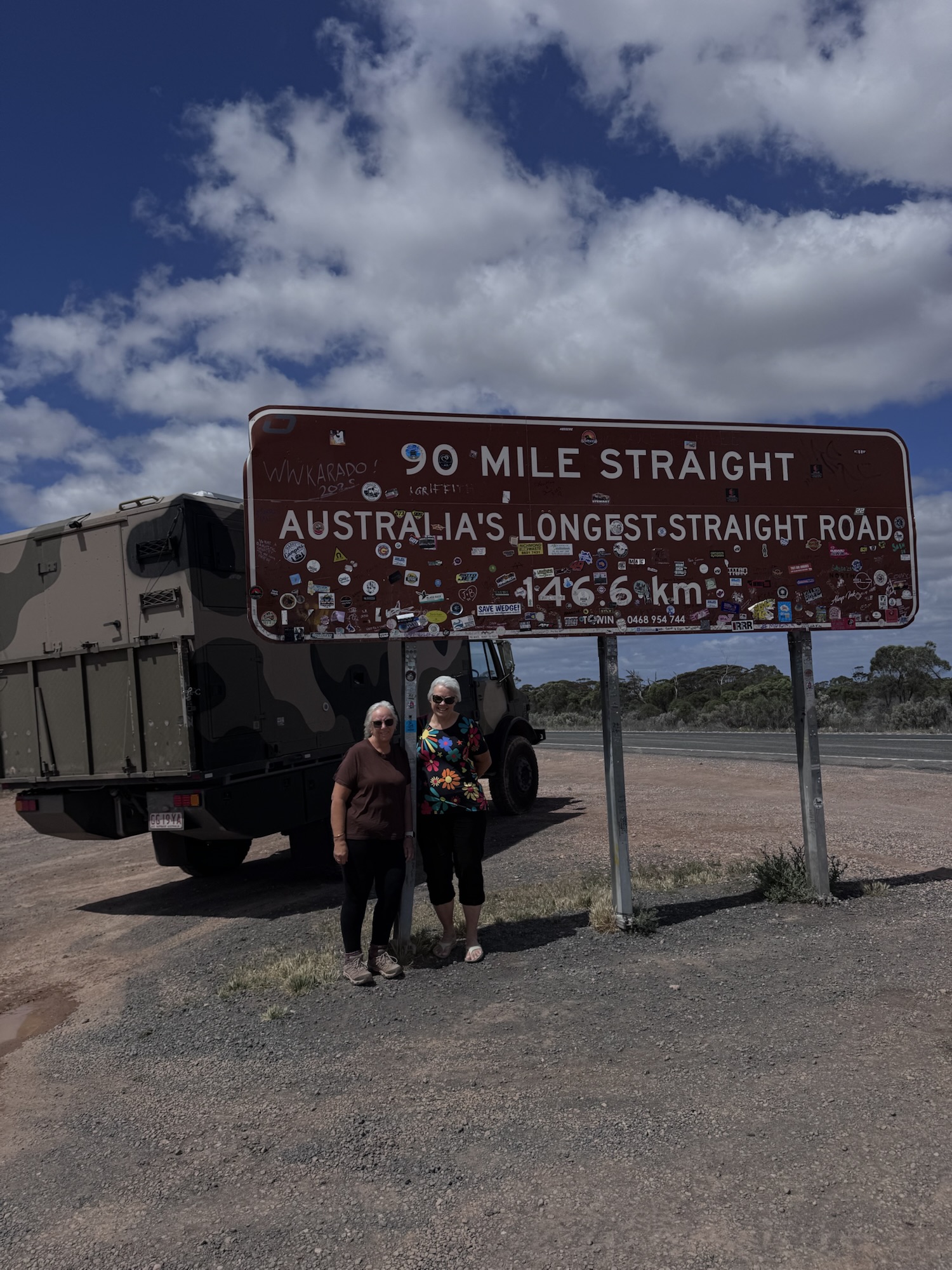 Next morning we were up early and raring to go. We stopped at the 90 mile straight sign for a photo shoot which is the beginning of Australia’s longest straight road – 146.6kms on the Eyre Highway. Unfortunately it was here the Unimog decided it wasn’t going any further. While Julie and I sat in ‘Where’s Wally’ to escape the flies, Rod and Brian performed some bush mechanics and we were soon on our way again.