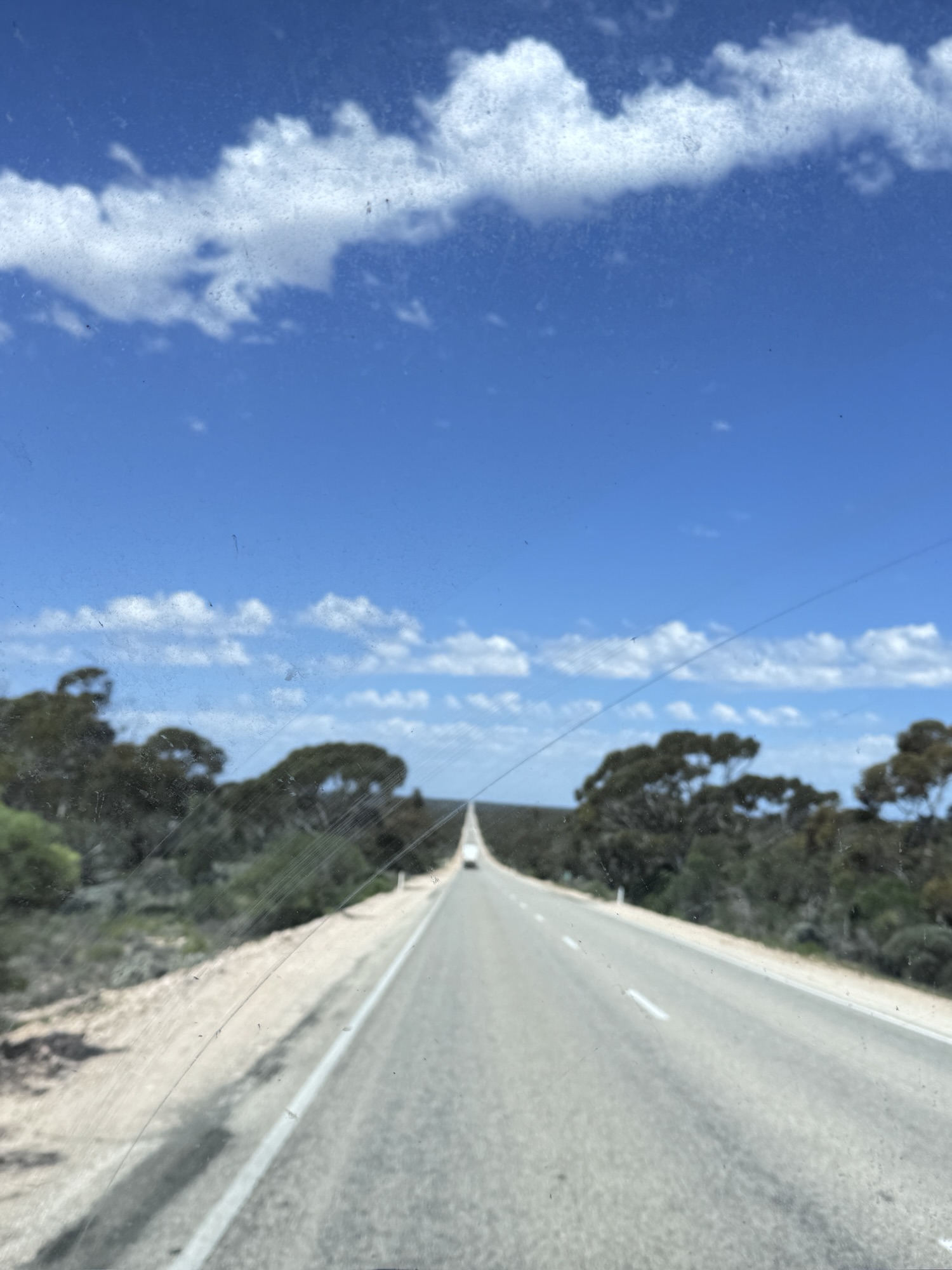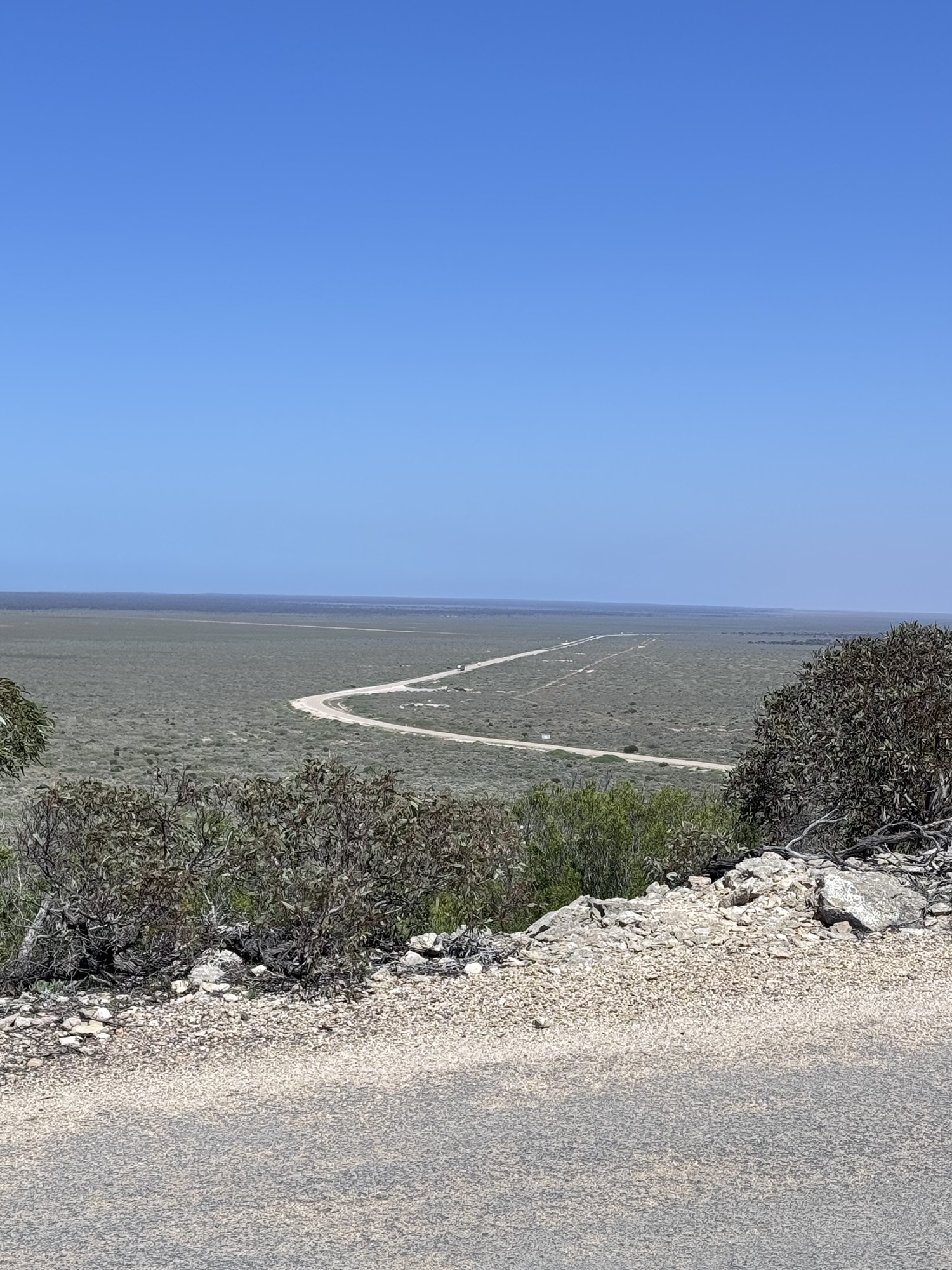 So we continued along the long straight stretch of road, which was amazing, not one curve! The landscape started to change and the Nullarbor lived up to its name – Nullarbor meaning ‘no trees’. There was hardly a tree to be seen, just a wide flat landscape.