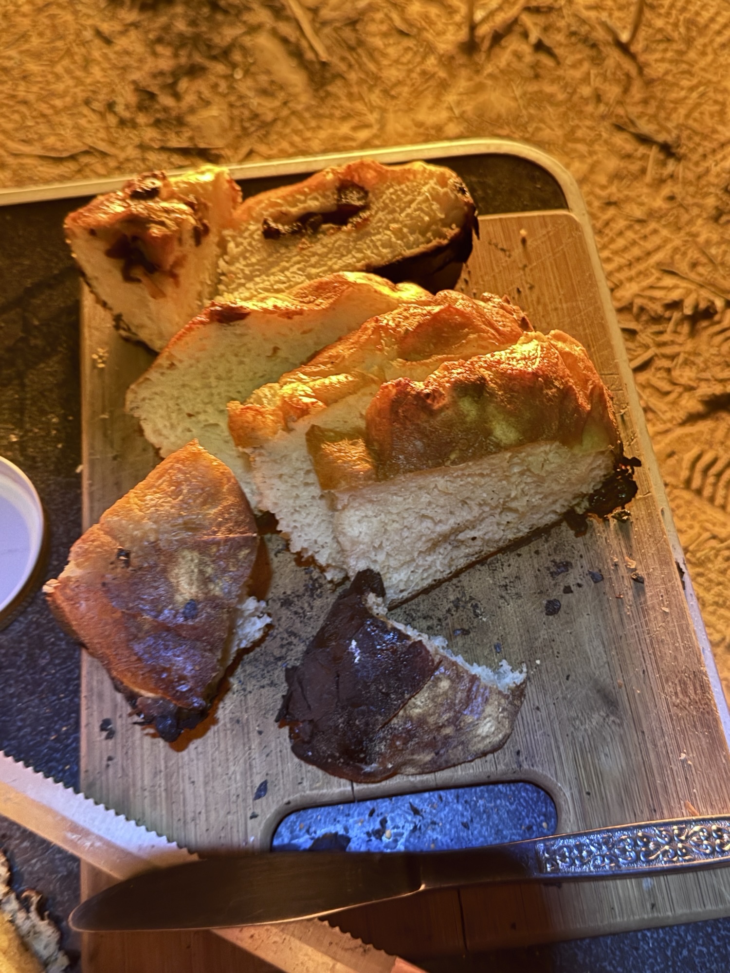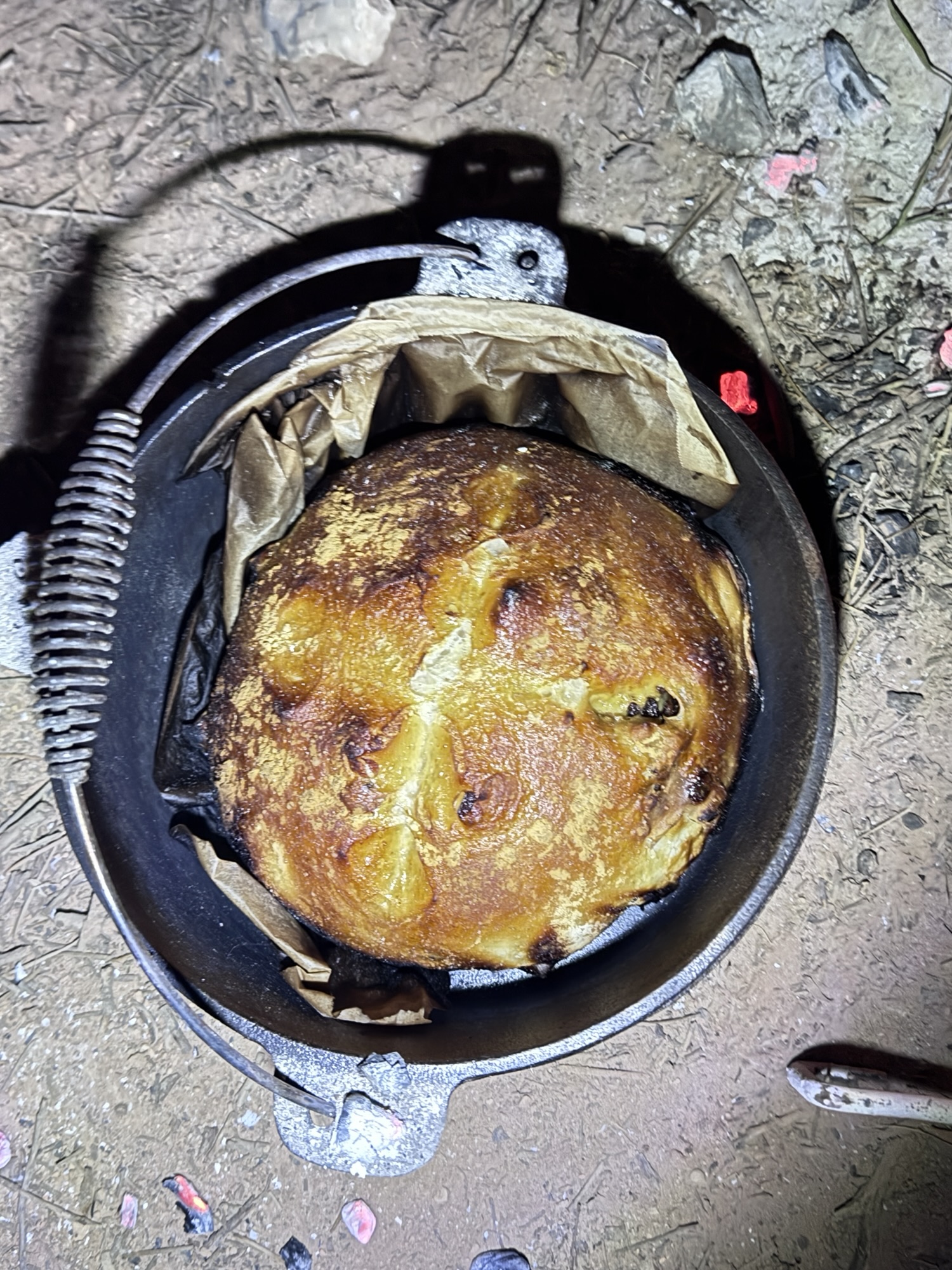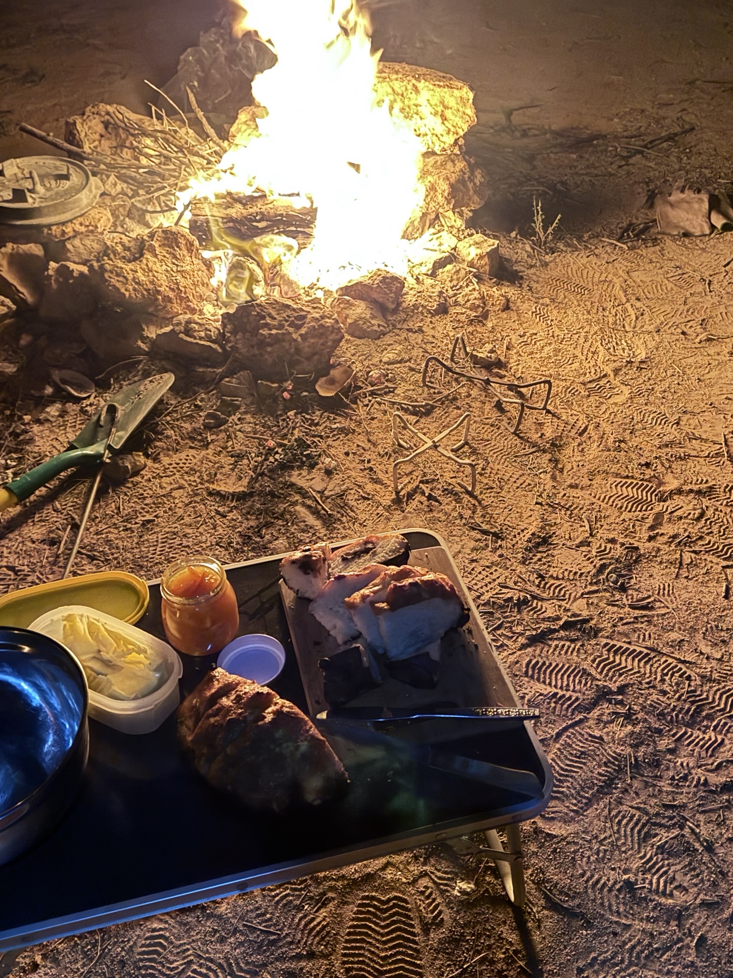 Campfire cooking is always fun, tonight it was fruit bread with butter and honey.